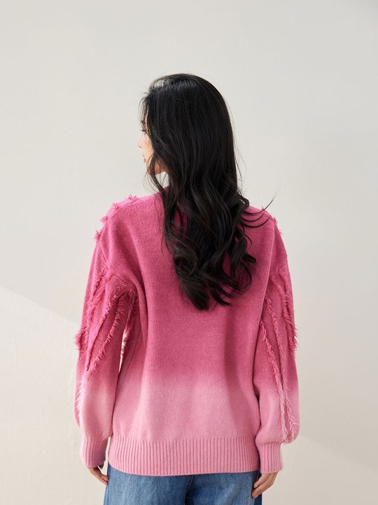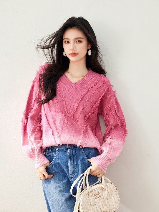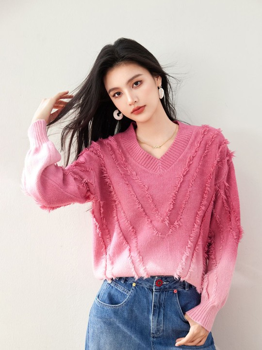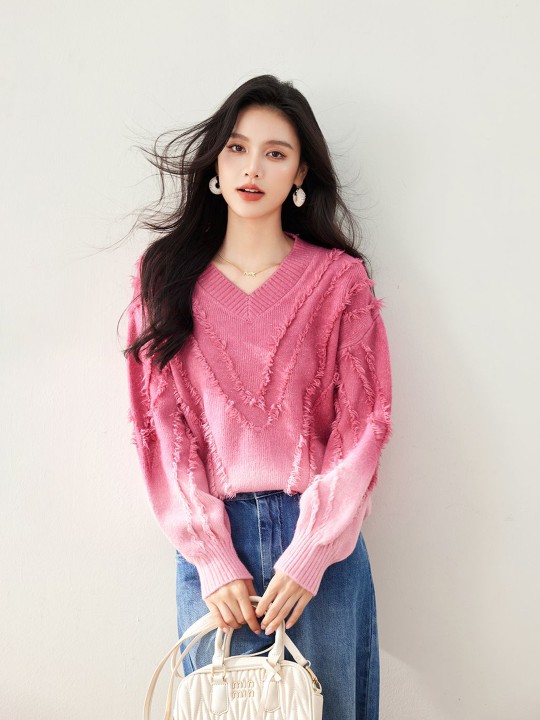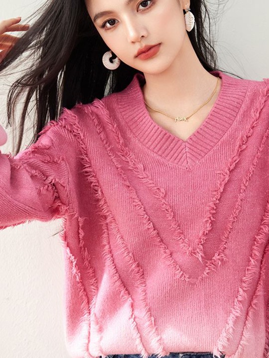 Pink self design fuzzy pullover ,has a v-neck, na pockets, long sleeves, ribbed hem